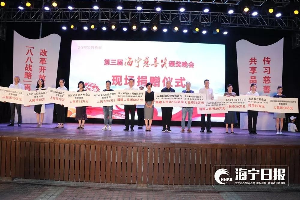 昨天晚上,由海寧市人民政府主辦的第三屆“海寧慈善獎”頒獎晚會在海寧文化館廣場盛大舉行,19個“捐贈企業(yè)獎”、10名“慈善之星”、10個“慈善組織獎”、10個“慈善項目獎”受到了表彰。本集團(tuán)獲得了“捐贈企業(yè)獎”榮譽(yù)稱號。評選委員會給予“捐贈企業(yè)獎”的頒獎詞是:“如果說企業(yè)家身上要流淌著道德的血液,那么,企業(yè)就是社會責(zé)任的承擔(dān)者和社會良心的守望者。在海寧,有一大批企業(yè),如萬川歸海,用創(chuàng)新涌起經(jīng)濟(jì)的浪潮,用慈善重寫財富的價值。”
