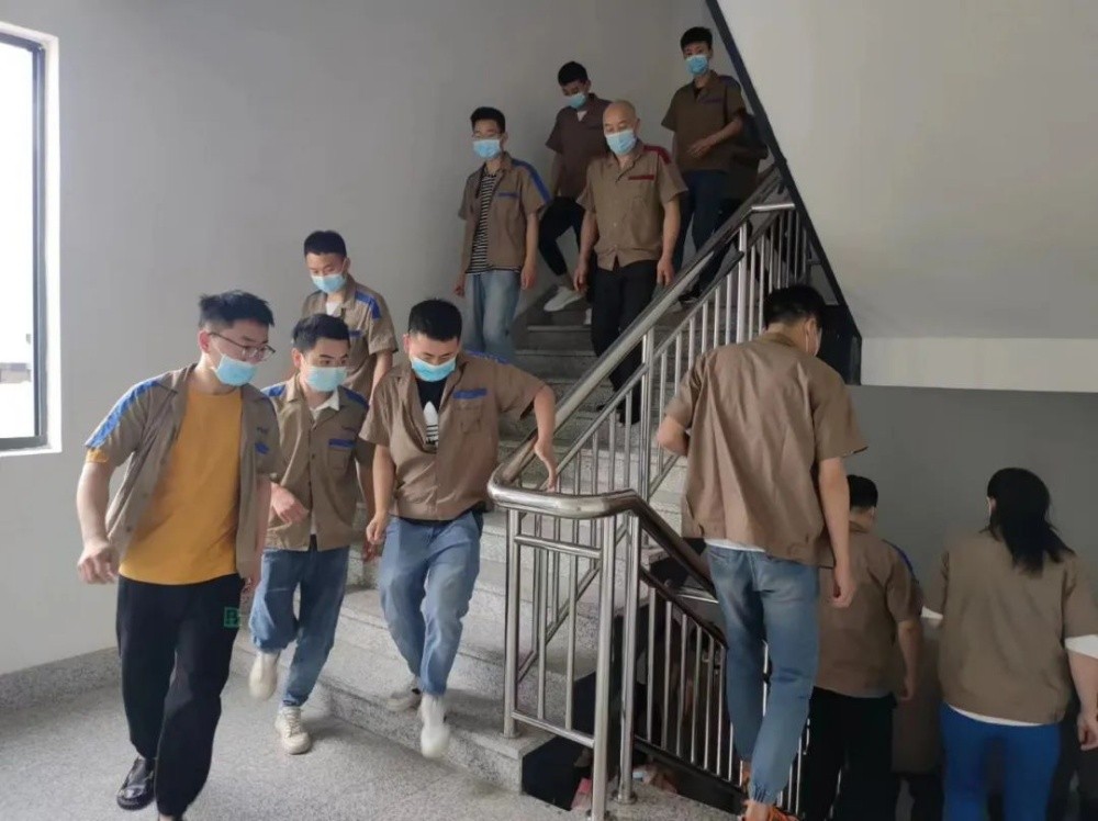 公司領(lǐng)導(dǎo)在得知火場情況后(火警鈴響起),立即作出全部疏散命令,各車間主任、班組長有序組織人員通過疏散逃生通道撤離到“緊急集合點”并及時清點人員。